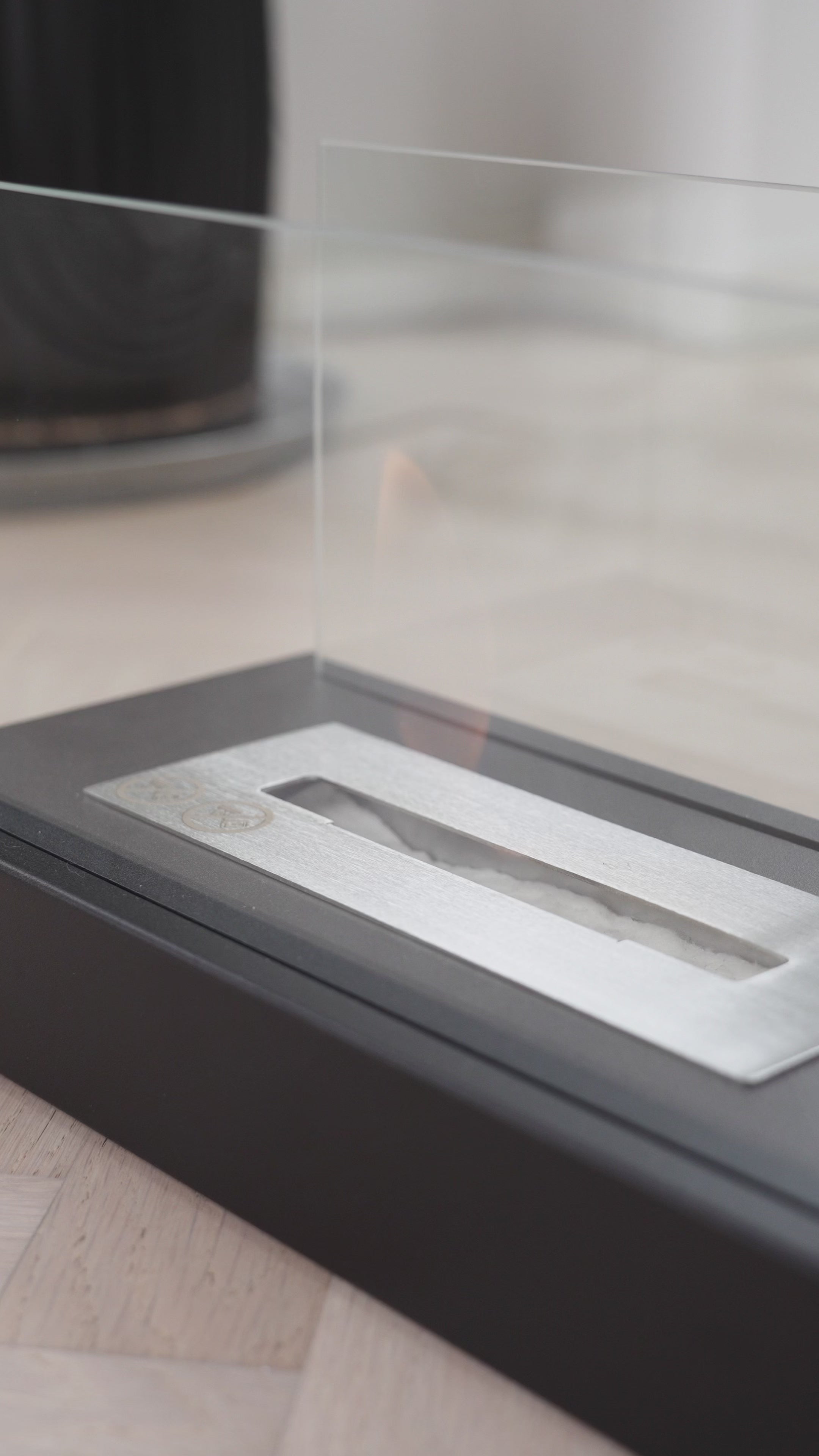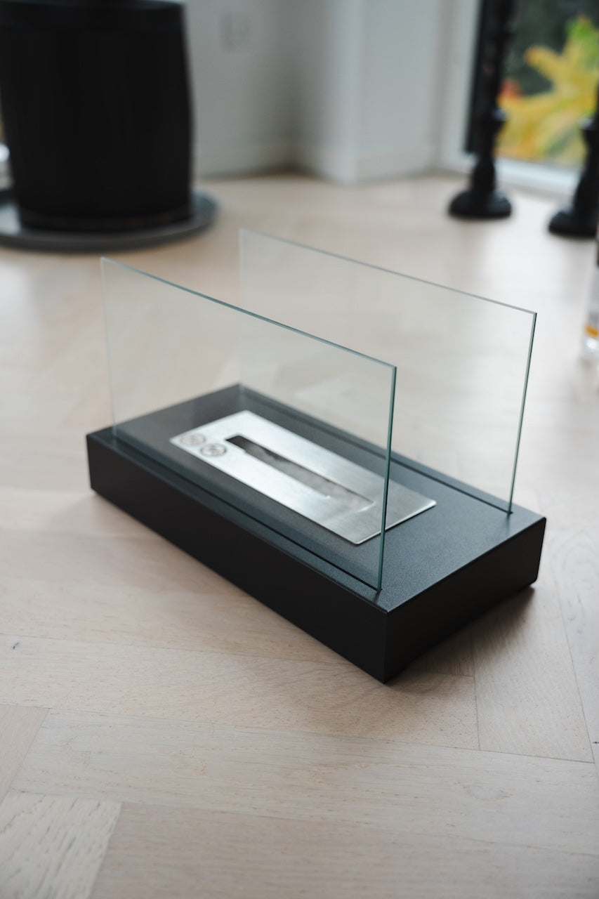 Den kan stå på bordet, i vindueskarmen eller ude på terrassen en kølig aften. De hærdede glas på begge sider indrammer flammerne smukt og gør oplevelsen både tryg og elegant.